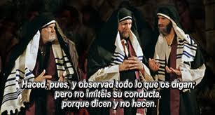 Jesús dijo a la multitud y a sus discípulos: Los escribas y fariseos ocupan la cátedra de Moisés; ustedes hagan y cumplan todo lo que ellos les digan, pero no se guíen por sus obras, porque no hacen lo que dicen. Atan pesadas cargas, difíciles de llevar, y las ponen sobre los hombros de los demás, mientras que ellos no quieren moverlas ni siquiera con el dedo. Todo lo hacen para que los vean: agrandan las filacterias y alargan los flecos de sus mantos; les gusta ocupar los primeros puestos en los banquetes y los primeros asientos en las sinagogas, ser saludados en las plazas y oírse llamar "mi maestro" por la gente. En cuanto a ustedes, no se hagan llamar "maestro", porque no tienen más que un Maestro y todos ustedes son hermanos. A nadie en el mundo llamen "padre", porque no tienen sino uno, el Padre celestial. No se dejen llamar tampoco "doctores", porque sólo tienen un Doctor, que es el Mesías. El mayor entre ustedes será el que los sirve, porque el que se eleva será humillado, y el que se humilla será elevado.